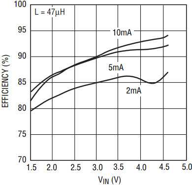 The LTC3450 also provides inrush current limiting during start-up (Figure 2), as well as output disconnect and active discharge in shutdown mode. The LTC3450 is stable with ceramic capacitors and its internal compensation eliminates the need for an external R-C compensation network. The LTC3450 also features a wide input voltage range of 1.5V to 4.6V, making it compatible with a wide variety of battery or fixed DC voltage inputs. Very low quiescent currents allow the LTC3450 to deliver excellent efficiency over the entire input voltage range (Figure 3).