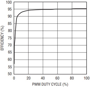 The three LT3496 channels operate independently, but function in the same way. For simplicity, the PWM operation of channel 1 is described here. If the PWM1 pin is pulled low, M1 is turned off, disconnecting the LED string of channel 1 and stopping the current draw from output capacitor C4. The VC1 pin is also disconnected from the compensation capacitor C8. C4 stores the state of the LED voltage and C8 stores the state of the LED current until PWM1 is pulled up again. This leads to a highly linear relationship between pulse width and output light, a large and accurate dimming range, and high efficiency. At 120Hz PWM frequency, the PWM control of the circuit allows 5000:1 dimming as shown in Figure 4. Figure 5 shows the efficiency as a function of the PWM duty cycle.