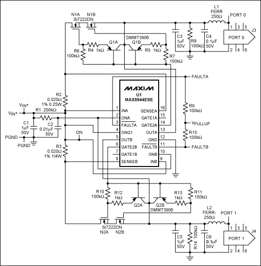 図2は、デュアルポートのFireWire保護回路です。その動作は、図1の回路とほぼ同じですが、OR接続MOSFETは含まれていません。OR接続機能を実現するには、N1とN2の前にOR接続MOSFETを追加し、GATE1AとGATE1BをそれぞれのOR接続MOSFETゲートに接続し、さらに、ピン4 (ONQ1)を接地します(VINには接続しない)。単一素子障害に対する保護機能は、各チャネルにおいて、シングルポートの保護回路の保護機能と同じです。