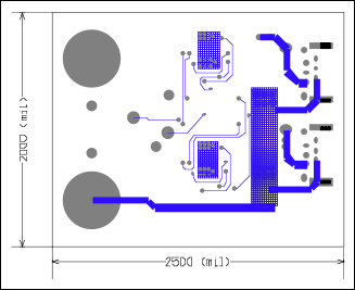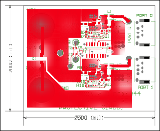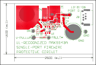 シングルポートのFireWire保護回路のPCBレイアウトは、図3、図4、および図5に詳しく示しています。デュアルポートのFireWire保護回路のPCBレイアウトは、図6、図7、および図8に詳しく示しています。どちらの場合も、大きな銅ヒートシンク領域が、検出抵抗器と各パワーMOSFETに付随していることに留意してください。レイアウトの細部は、UL認定には含まれませんが、最大負荷または短絡状態でMOSFETのピークジャンクション温度を安全制限に抑えるため、これらの回路を改造する場合には、必要に応じて、十分なMOSFET銅ヒートシンク領域を設ける必要があります。熱計算については、各MOSFETの過渡熱特性を参照してください。