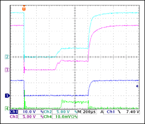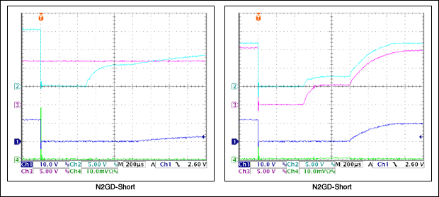 約0.5msの後、両方のゲートが上昇し、プログラムされた2.5Aの制限電流に対応するVGSで安定します。