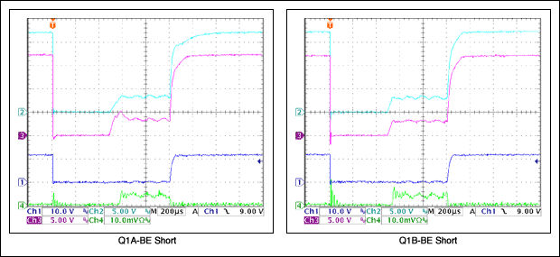 - Q1AまたはQ1Bのベース-コレクタ間短絡によって、GATE2と出力間の短絡が生じます。したがって、どちらのFETもターンオンしません。回路があらかじめオンにされていた場合、回路は安全にシャットダウンします。