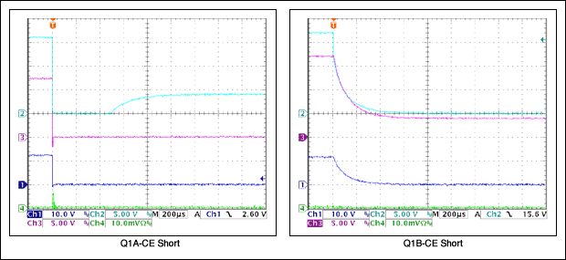 Q1AまたはQ1Bのコレクタ-エミッタ間短絡は、対応するゲートと出力間に1kΩの抵抗器を配置します。負荷電流は入力から出力に流れません。したがって、回路は安全です。ただし動作不能になります。負荷がないとき、出力は最終的に上昇しますが(約0.5µs)、適度な負荷抵抗が接続されていれば、出力は上昇しません。また、出力が無負荷で上昇した場合、負荷が接続されると出力は完全にドロップアウトします。対応するゲート駆動は約0Vですが、100kΩ + 1kΩの抵抗器(負荷抵抗器を経由してGATE2からGNDに直列接続)を流れる約40µAのプルアップ電流のため、GATE2端子と代替ゲートはGNDより約4Vまで上昇します。