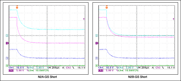 - N2AまたはN2Bのゲート-ソース間短絡によって、対応するFETがターンオフされ、回路は安全にシャットダウンします。この動作は、上記の2で説明したQ1AまたはQ1Bのコレクタ-エミッタ間短絡の動作とほぼ同じです。ただし、ゲートが入力電圧から約4Vまで上昇するため、代替FETはオンになります。
