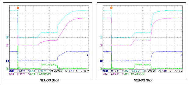 この付録で用意した基準波形一式は、N2A、N2B、Q1A、またはQ1Bに疑似短絡を適用せずに出力短絡を適用した場合のCH1 = VOUT、CH2 = N2BGATE、CH3 = N2AGATE、およびCH4 = IOUT (5A/div)を示しています。