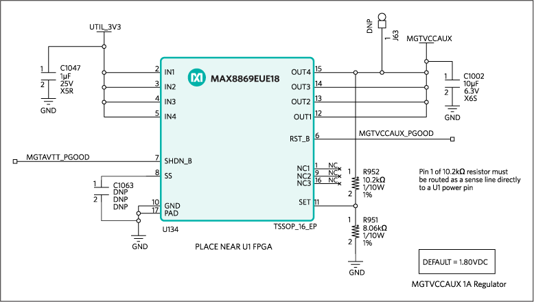 This reference design provides a power-supply circuit with an input voltage of 3.3V, an output voltage of 1.8V, and an output current of 1A using the MAX8869 low-dropout linear regulator. The circuit was developed to power a MGTVCCAUX rail on a Xilinx® Kintex® Ultrascale™ FPGA. Included in this reference design are a schematic and a bill of materials.