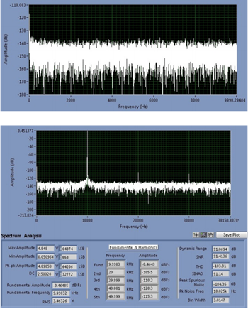 Figure 7. Performance of AD7980 using ADP5300 as VDD supply. Side bands due to switching ripple modulation can be seen around the fundamental signal (10 kHz ±4.5 KHz).