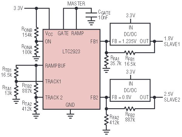 Power supply tracking is straightforward with the LTC2923. It controls two slave supplies that track a master signal. A pair of resistors configures the behavior of each slave supply relative to the master signal. The choice of resistors can cause a slave supply to track the master signal exactly or with a different ramp rate, voltage offset, time delay, or combination of these.