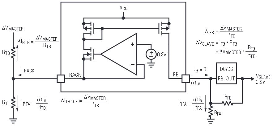This change in current is mirrored at the FB pin. Since the DC/DC converter regulates its feedback node to 0.8V, the voltage across RFA is fixed at 0.8V, and thus the current through RFA is also fixed. Any change in the current from the FB pin results in an equal change in the current across RFB. If RTB = RFB then any change in voltage at VMASTER results in an equal change in the voltage at the DC/DC converter’s output, VSLAVE. If RFB is increased relative to RTB the voltage change at VSLAVE is greater than the voltage change at VMASTER. The change in voltage at the DC/DC converter’s output is:
