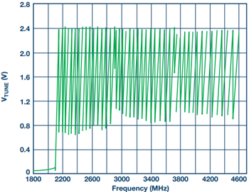 The first generation of these PLL/VCO chips had over 4 GHz of bandwidth! Compare that to the discrete 100 MHz to 300 MHz bandwidth—and this frequency range was possible from a tiny chip relative to the previously required banks of PLLs, VCOs, filters, and switches. Figure 2 shows the tuning voltage vs. output frequency of a multiband PLL/VCO. In this example, the fundamental VCO output range was specified as 2200 MHz to 4400 MHz. This was complemented with a bank of dividers after the VCO output, but internal to the chip, which could divide the signal to as low as 35 MHz; hence the >4 GHz bandwidth—all from one 5 mm × 5 mm package.