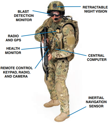 データ・リンクが広帯域化することで、兵士へのデータ送信が可能になるだけでなく、兵士からのデータ送信も可能になります。これらのデータの例としてはライブ・ビデオ・フィードや装備管理情報などがありますが、将来的には、ヘルス・モニタリングや慣性航法情報などの機能も含まれることになるでしょう。現代および次世代の兵士による使用が予想されるシステムの一部を、図1 に示します。