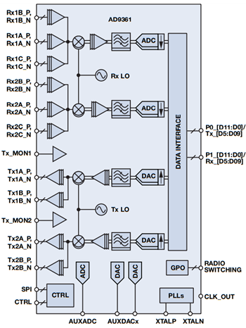 通信データ・リンクをサポートするために、AD9361 のような設定自由度の高いトランシーバー・デバイスや、ADF7023 やADF7024 といったISM バンド・デバイスは、ワイヤレス接続用のソリューションを提供します。AD9361 と AD9364 は設定自由度の高い RF-to-Bits トランシーバーで、200 kHz ~ 56 MHz のチャンネル帯域幅で、70 MHz ~ 6 GHz の RF 周波数範囲の通信リンクに対応可能です。このデバイスは、直接変換アーキテクチャを採用し、低ノイズ・アンプ、ミキシング段、高速コンバータ、直交誤差補正アルゴリズムを含むデジタル・シグナル・プロセシング回路のすべてを 10 mm2 のパッケージに集積化しており、広帯域通信リンク用に真の RF-to-Bits ソリューションを提供します。このデバイスは動的に設定を変更できることから、すでに防衛用通信に広く使われています。同様にソフトウェアによっても設定を変更できるため、前述の UAV のように、通信データ・リンクに対する他の多くの要求に対して 1 つのソリューションを提供します。このようにデバイスを再設定できることで、真のソフトウェア無線(SDR)の実装が可能になり、開発された 1 つのハードウェアをさまざまなシステムに使用することができます。特に、消費電力が代表値で 1 W未満の場合に有効です。