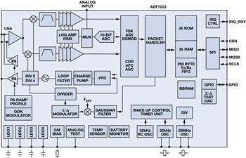 ADF7023、ADF7024、および ADF7242 は、超低消費電力の集積化トランシーバーです。これらは免許不要の ISM バンド、すなわち 433 MHz、868 MHz、915 MHz、2.4 GHz での使用と、周波数シフト・キーイング(FSK)またはガウス型周波数シフト・キーイング(GFSK)による波形変調、およびより低いデータ・レートに合わせて設計されており、ADF7024 の最大データ・レートは 300 kbps、ADF7242 の最大データ・レートは 2 Mbpsです。これらのデバイスは AD9361 ほどの柔軟性は備えていませんが、同じレベルの機能が組み込まれており、RF-to-Bits 動作にも対応可能です。例えば、ADF7024 は 5 mm2 のパッケージでこれらの機能を提供し、消費電流はレシーバー・モードで12.8 mA で、消費電力レベルと長期的動作がきわめて重要な、センサー・データの送受信アプリケーションに使用することができます。