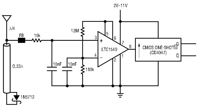 The rectified output is monitored by the LTC1540 comparator. The LTC1540’s internal reference is used to set up a threshold of about 18mV at the inverting input. A rising edge at the comparator output triggers a one-shot, which temporarily enables answer-back and any other pulsed functions.