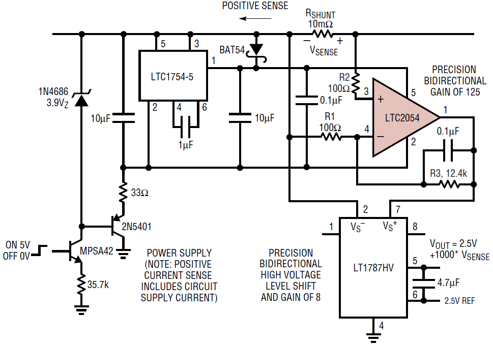 The LT1787HV level shifts the sense output to ground, and provides bidirectional output capability. The initial gain of 125 provided by the LTC2054 ensures that the accuracy is preserved despite the use of a less accurate level-shift circuit. As in the low-side current sense circuit, the low input offset of the LTC2054 allows the use of a small sense resistor without giving up precision, even with relatively low shunt currents.