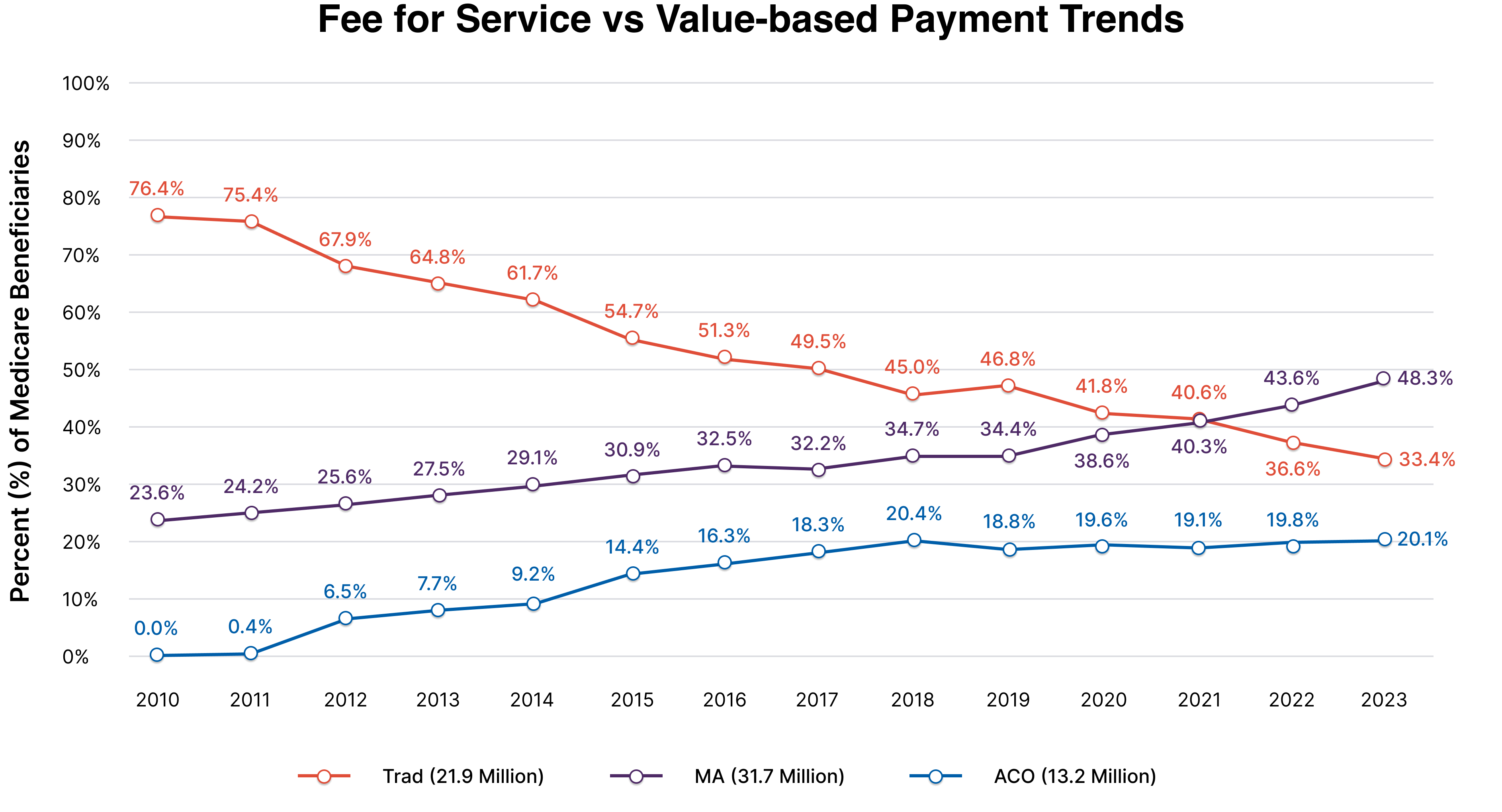 現在、米国では6500万人を超える患者がメディケア(Medicare)に加入しています。その中でメディケア・アドバンテージ(MA)に加入している人は3100万人以上に達します6。MAの加入者数は、2026年までに3700万人以上にまで増加すると予想されています7。以下のグラフを見ると、この動きが加速していることがわかります。