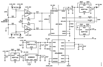 通过1 mΩ电阻的±25 A电流形成±25 mV的电压。 然后,该电压由AD8639放大至±250mV,并输入AD7401A。 AD7401A的差分输入充当传输三运算放大器仪表放大器配置中的差动放大器。